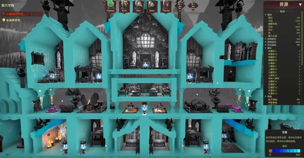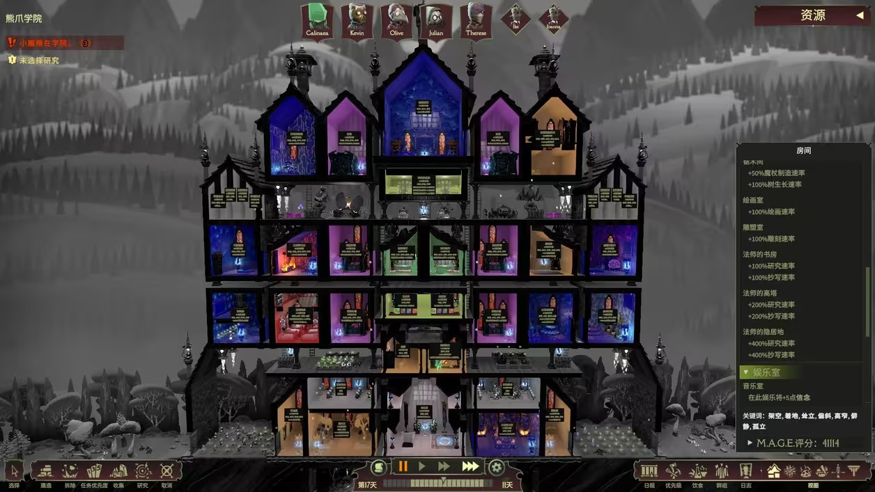 3、人员招募:游戏一共七个魔法派系,我是希望角色越少越好,所以我的计划是招募两个风魔杖乌鸦,两个暗魔杖乌鸦负责战斗,一个生魔杖支璃人(不怕植物debuff),一个土魔杖狼人,一个火魔杖人类,一个电魔杖活灵人负责日常,配合上各种缝合物应该是足够了。中间的四个高级卧室是留给战斗人员的,因为战斗人员需要刷尽量多的试炼与奖章来增加力量(我目前最高刷到115力量乌鸦),就需要应对天赋带来的极度波动-40信念和乌鸦-15信念的冲击,顶层的两间普通卧室就留给剩下的四个工具人,他们也不需要具有天赋,信念值很容易稳住。