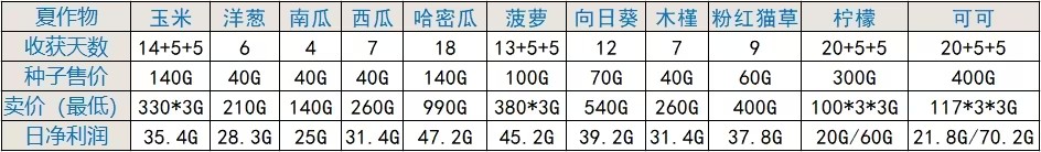 开局先去杂货店把夏季的作物都买一些回来种,建议每种3包,前期多了浇水会耗费太多体力,后期解锁自动浇水就可以多种了。