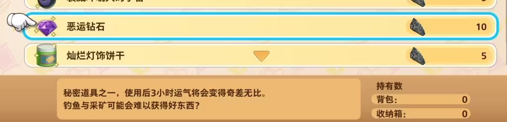 如果你春季挖矿把金属碎片都卖掉了也没关系,等解锁小精灵之后,从那里花10碎买一个恶运钻石,使用后3个小时内,去矿场挖矿所有挖到的东西都会变成金属碎片,我挖满3个小时大约能挖70~80个碎片。